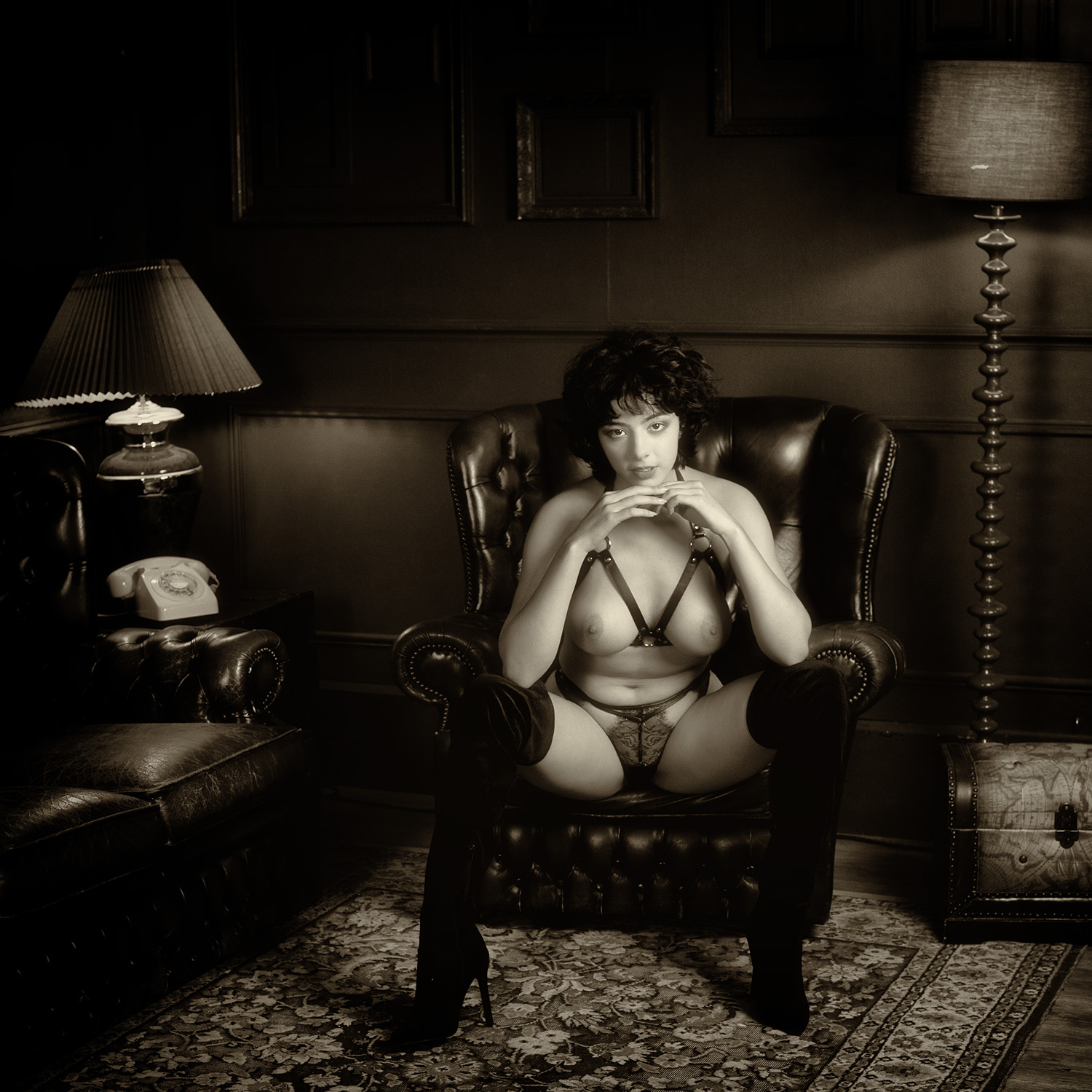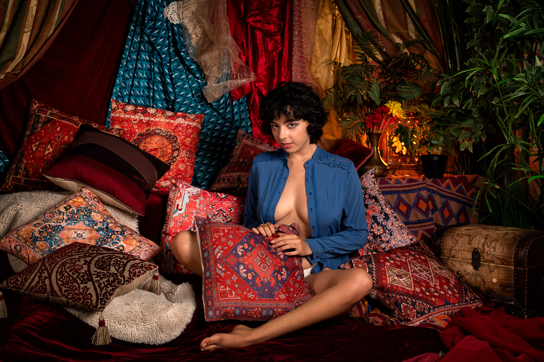 This time a remote shoot with AJ the model at Kempston studio (UK). We had contact before the shoot via Purple Port and email. Also I contacted the studio Owner Andy about the sets I would like to have. The studio has spece for a few great sets, Andy can change options very fast. I decided to go for 2 very different options: a Morrocan boudoir and a gentlemen's club.